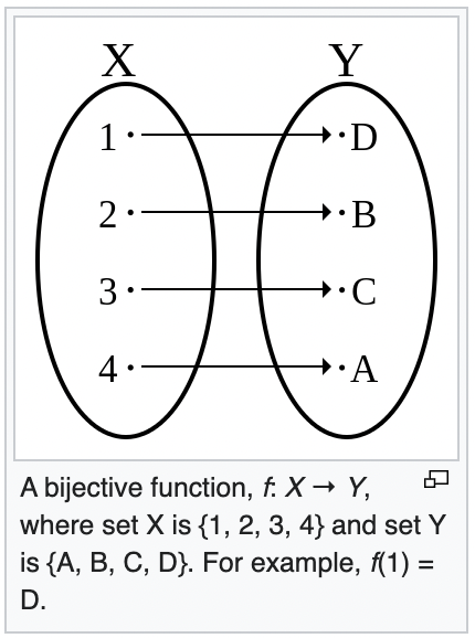 aliases: [bijection, bijective, Bijective, Invertible function, One-to-one correspondence]