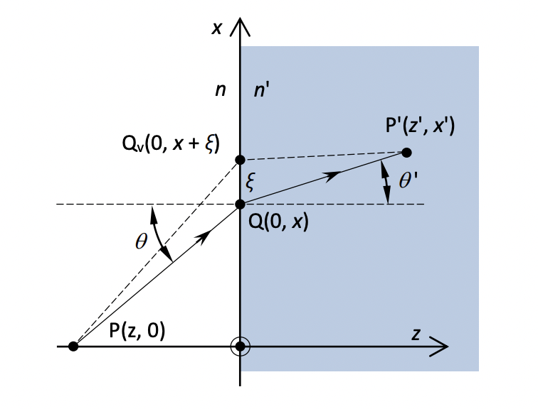 We have two media with refractive indices of and . They are homogeneous, so light propagates along a straight line in them, so we only look at such paths. Point is where the lightray goes through the boundary surface between the media.
