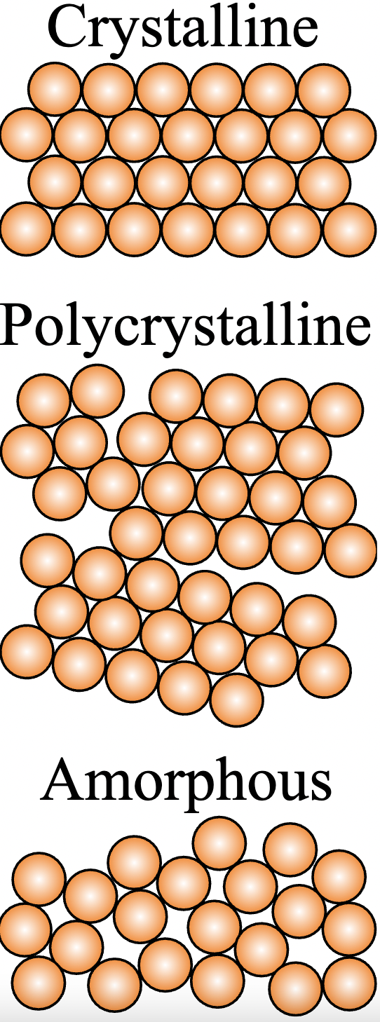 Polycrystals are materials that are composed of many crystals of varying size and orientation. Most materials are polycrystalline, made of a large number of crystallites held together by thin layers of amorphous solid.