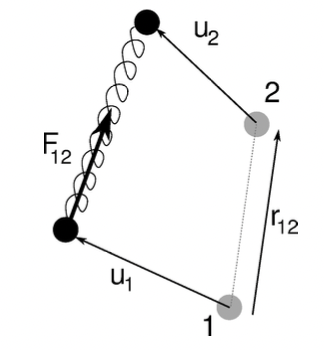 Where is the prestress of the spring in question (a spring is prestressed if it is already has tension on it when the atoms are in equilibrium) and is the spring constant. Let , the difference of the displacements. In harmonic approximation, is small. We expand the force until first order in :